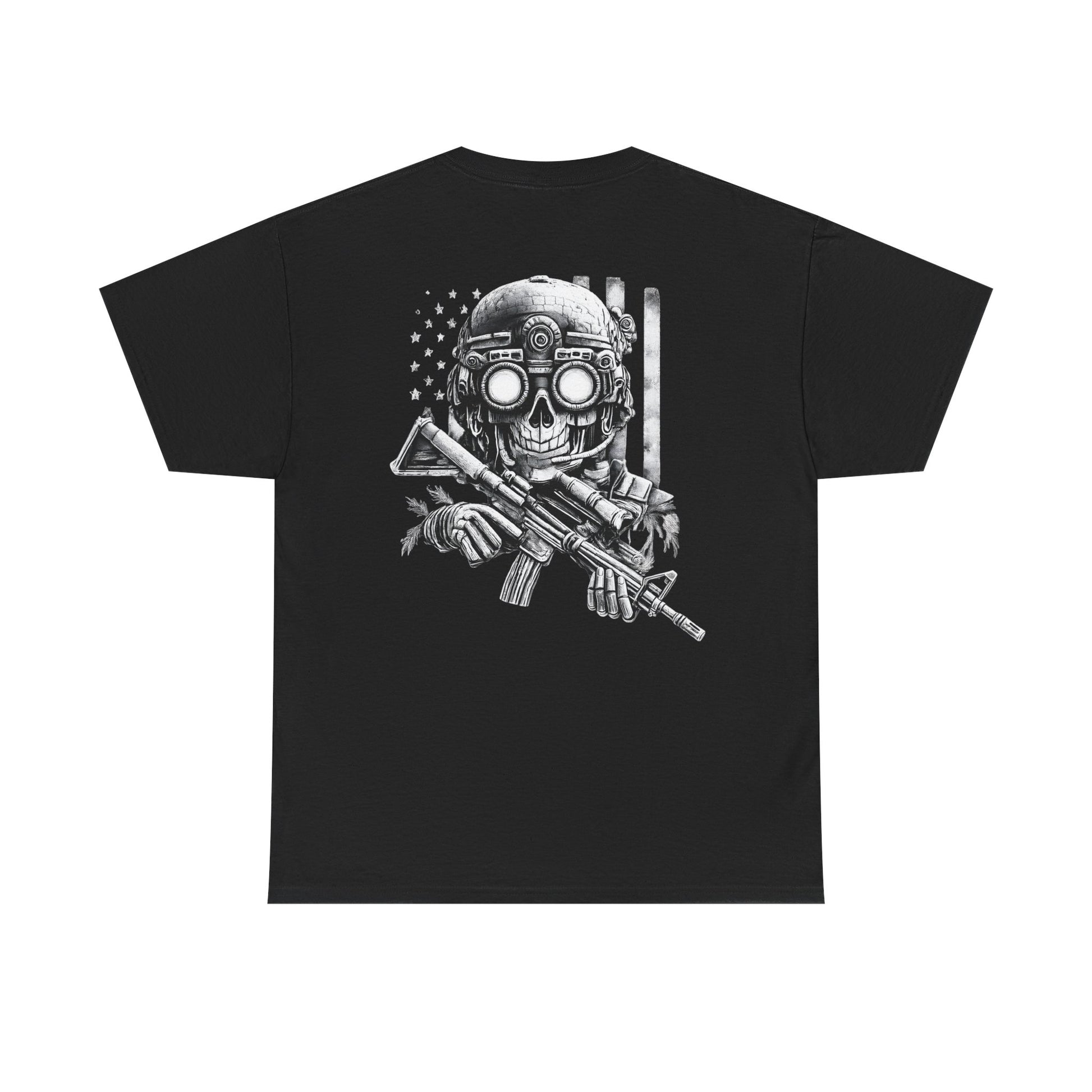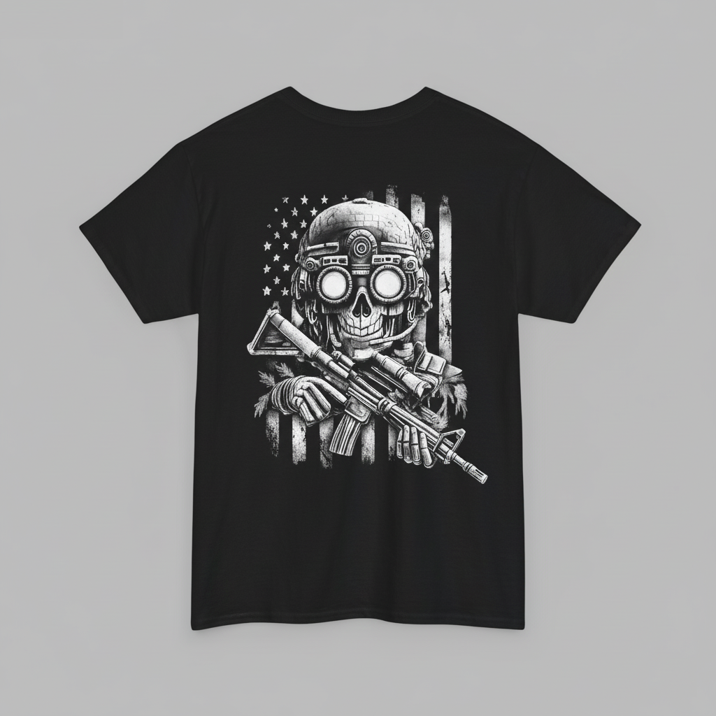 Printed in high-contrast white ink on a deep black canvas, the artwork delivers a stark, battle-worn aesthetic that feels earned, not manufactured. Every detail is deliberate. Nothing unnecessary. Built for those who live by a code.